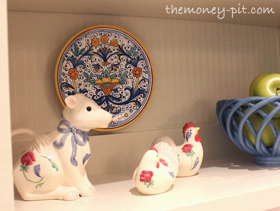I decided to add my collection of Lennox serving pieces I got for my wedding. The cow is a creamer, and the chickens are salt and pepper shakers: