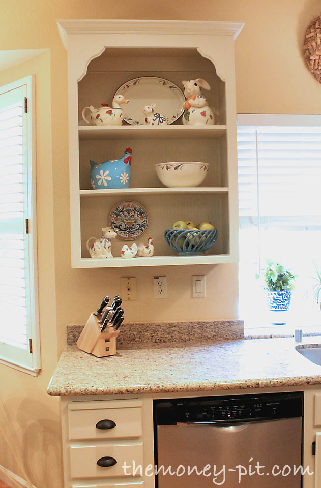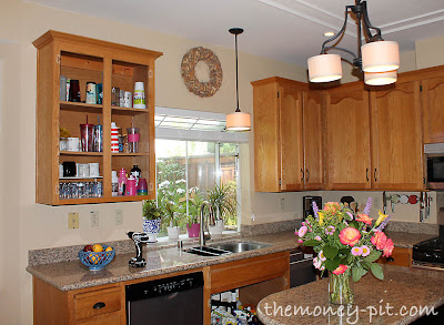 It was a look I had pinned dozen of times on my "Kitchen" Pinterest board, but I didn't want it to look like I just took doors off a cabinet. I wanted it to look CUSTOM. So I looked around my kitchen and tried to figure out which cabinets I could easily convert yet wouldn't look like doorless cabinet boxes.