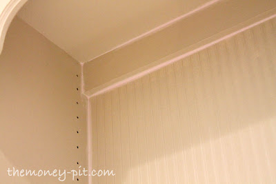 More spackle and another coat of paint.. but I didn't want to stop there. My inspiration cabinets also had a beadboard backing.